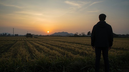 広大で平坦な水田地帯で、刈り取りが