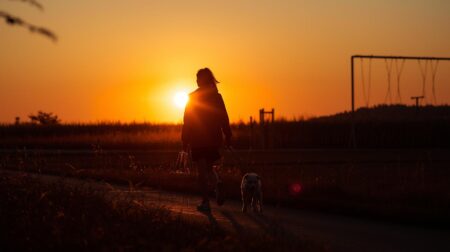 中型犬を連れて