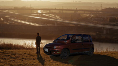 車の脇に立つ日本人男性の